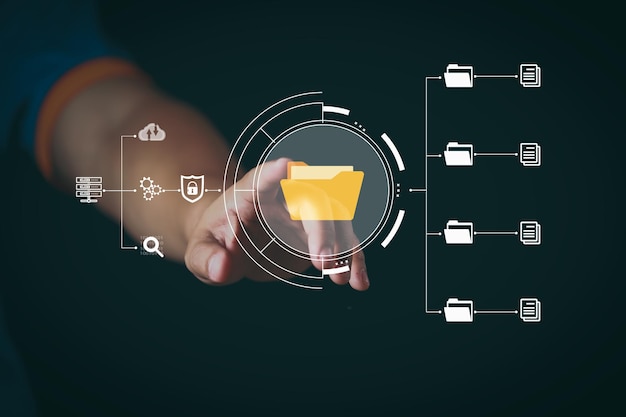 Digital hand pointing at a virtual file folder icon with futuristic interface representing data storage cloud computing information management and secure document organization in technology